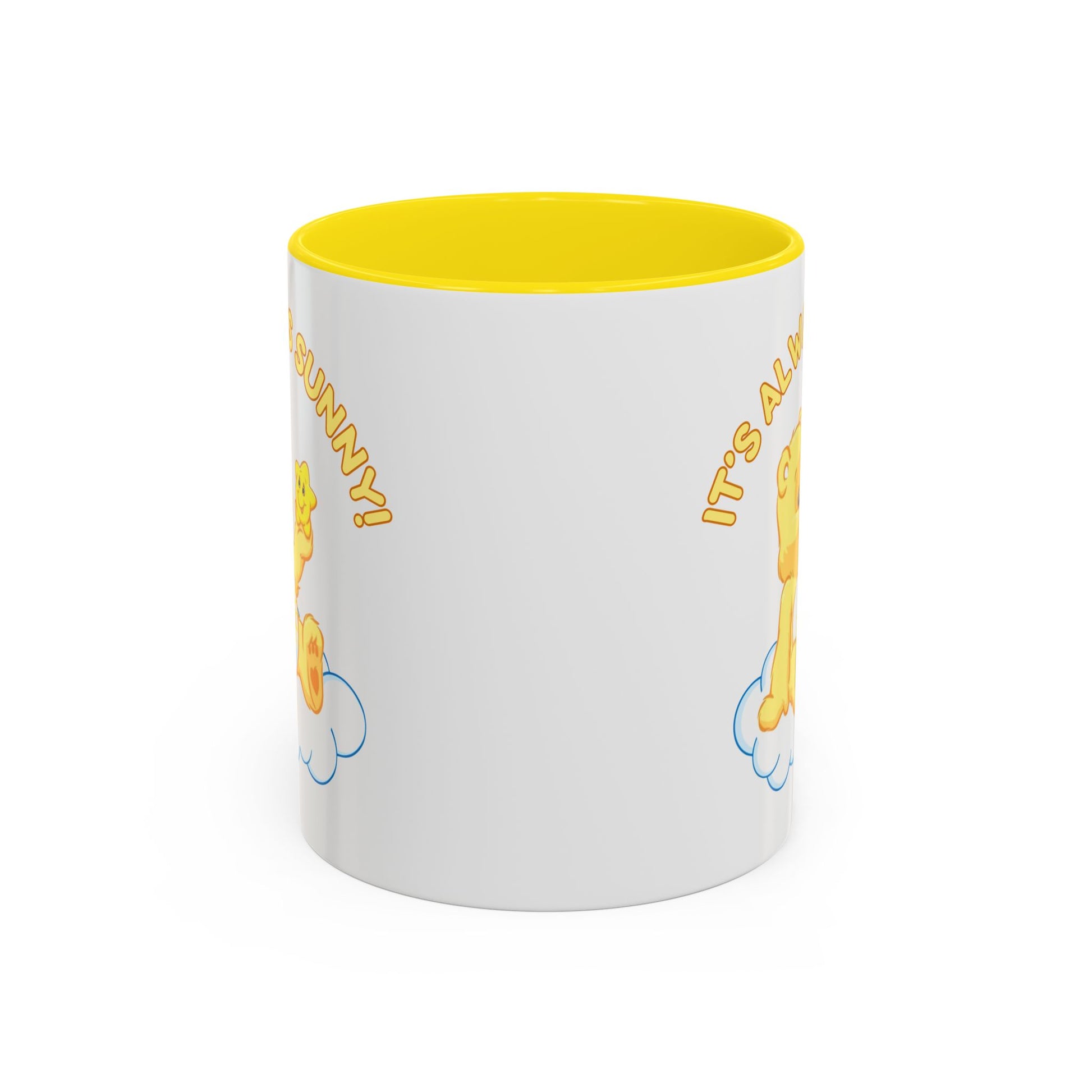 Bright mornings and slow, comforting sips—this ceramic mug brings a warm pocket of nostalgia to your day. The sunrise-yellow interior and handle frame a cheerful illustration of a friendly bear lounging on a cloud, holding a smiling sun. Short, sunny lettering arches above: “It’s Always Sunny.” Each drink feels like a little pause, a small ritual that invites calm and a gentle grin.