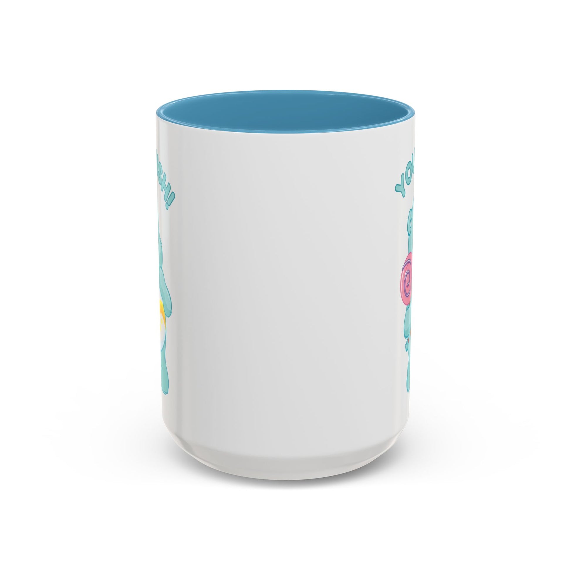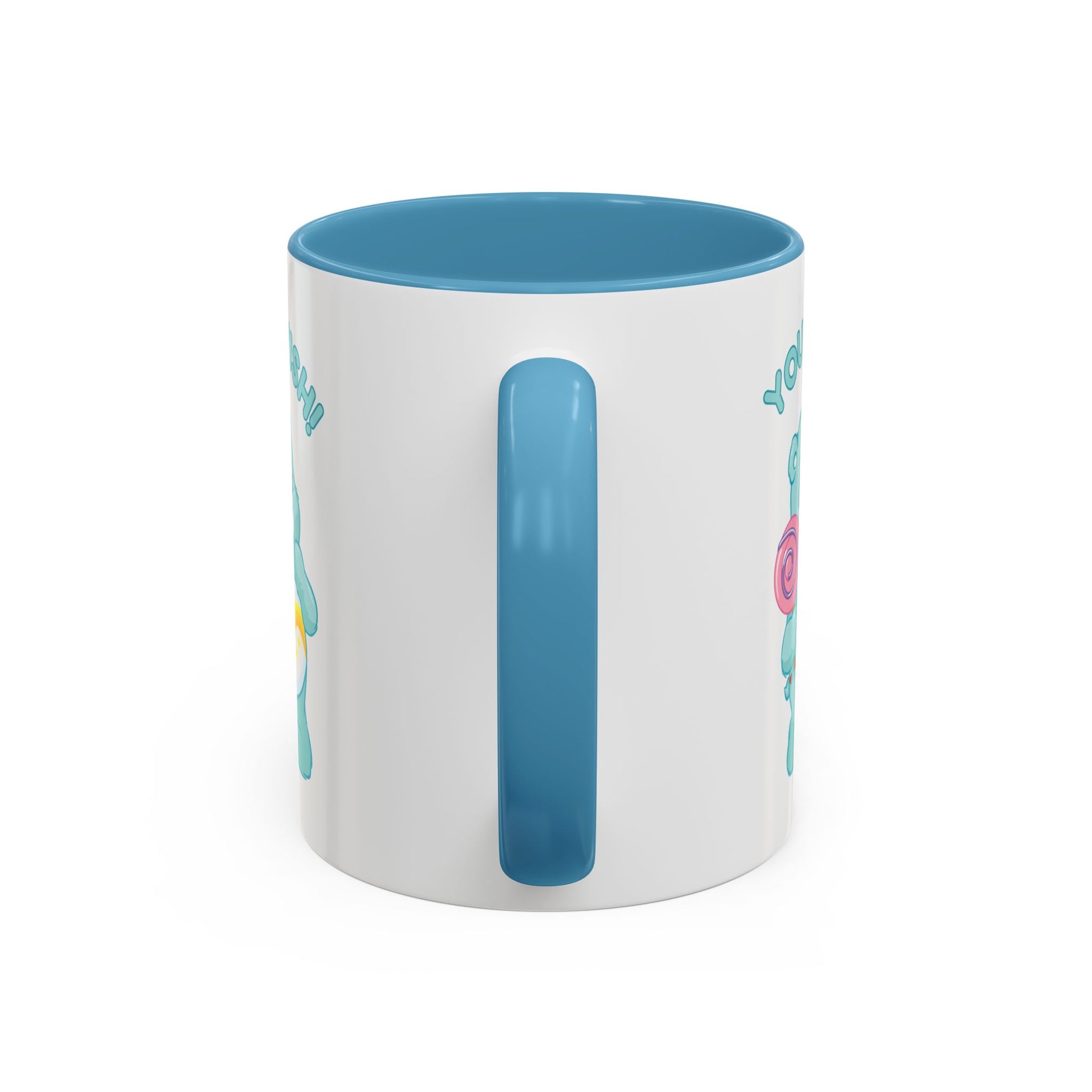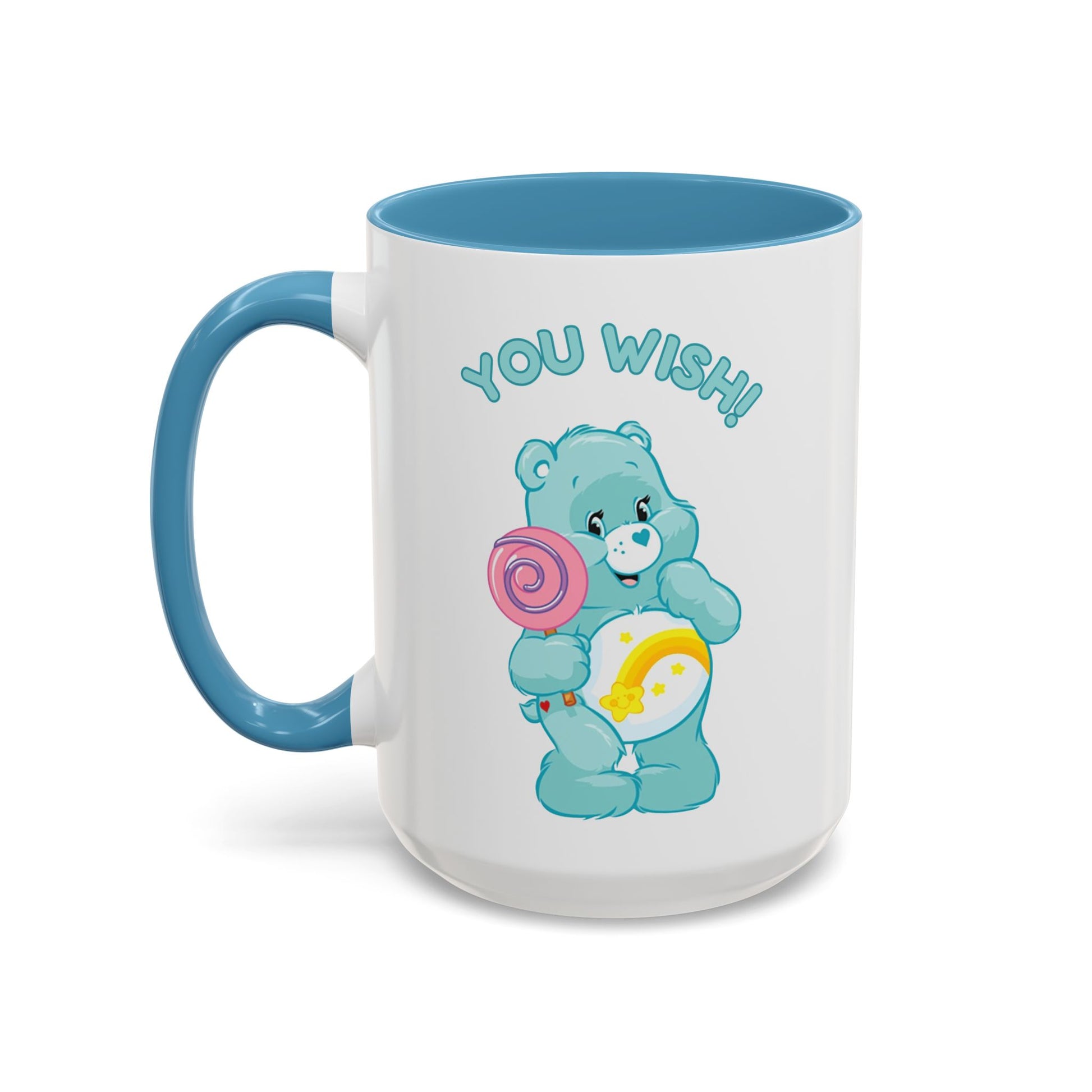 A cheerful ceramic mug that brings a playful, nostalgic vibe to morning coffee or late-night cocoa. Bright, high-contrast colors wrap a happy teal bear holding a lollipop and smiling with a wink beneath the phrase “YOU WISH!” The colored interior and handle add a fun pop that complements the glossy white exterior. Lightweight but sturdy, it feels familiar in hand with a comfortable C-shaped handle — great for a quick pick-me-up at the desk or a warm cup while curled up with a favorite show.