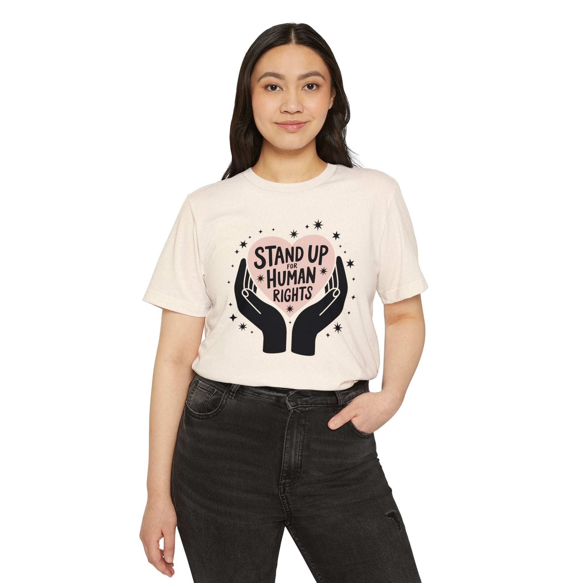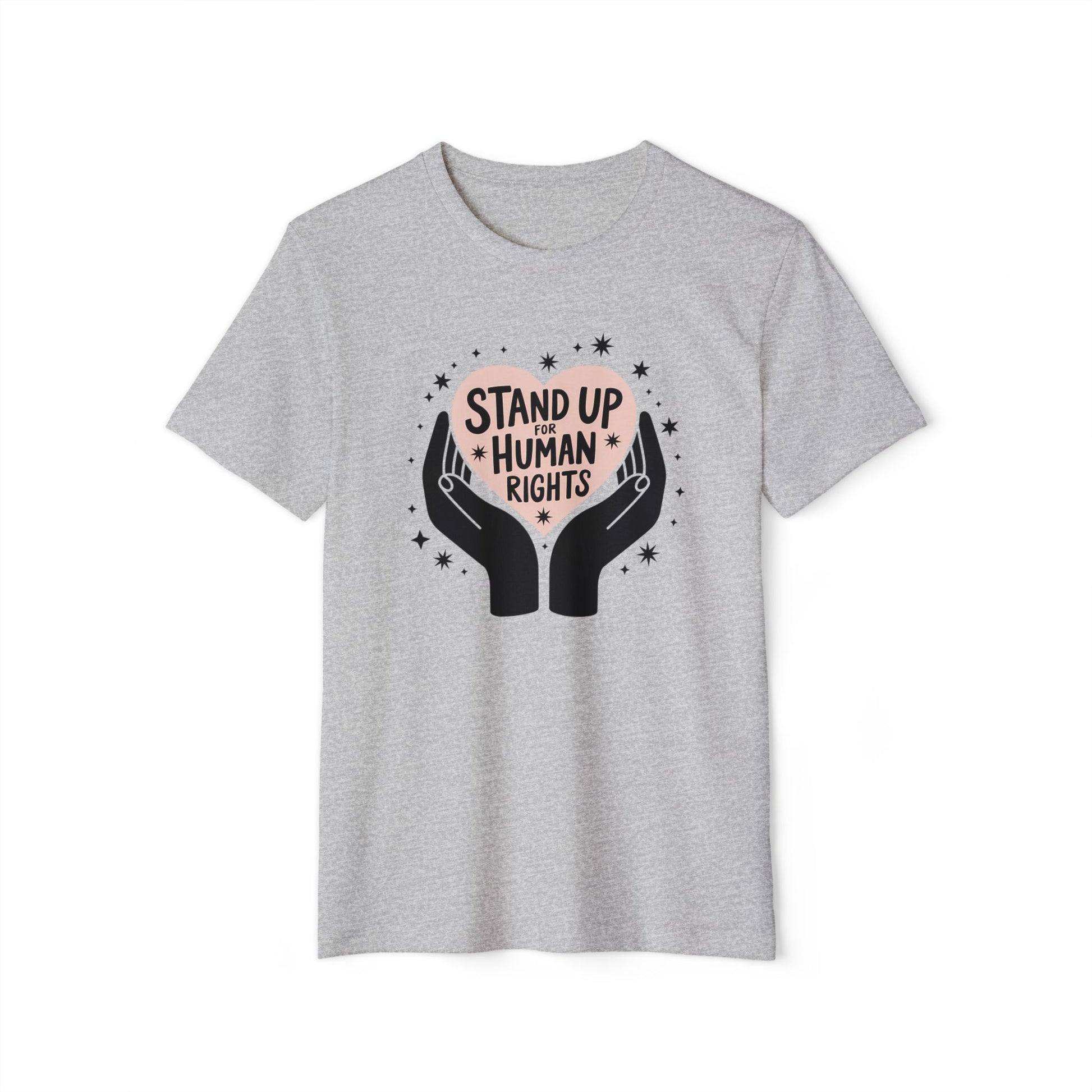 Introducing our eco-friendly Unisex T-Shirt, a perfect blend of comfort and sustainability. This T-Shirt features a scoop-shaped high neckline and offers a semi-relaxed fit, making it an ideal choice for everyday wear. Made from 55% organic cotton and 45% recycled polyester, it provides a soft touch while supporting the planet. The stylish design celebrates human rights, making it a great conversation starter. Feel empowered as you wear this tee, perfect for social gatherings, activism events, or just lounging at home. It's a thoughtful gift for anyone passionate about social justice and environmental issues, making it an excellent choice for holidays like Earth Day, Human Rights Day, or even birthdays for eco-conscious friends. Embrace comfort and style while making a statement.