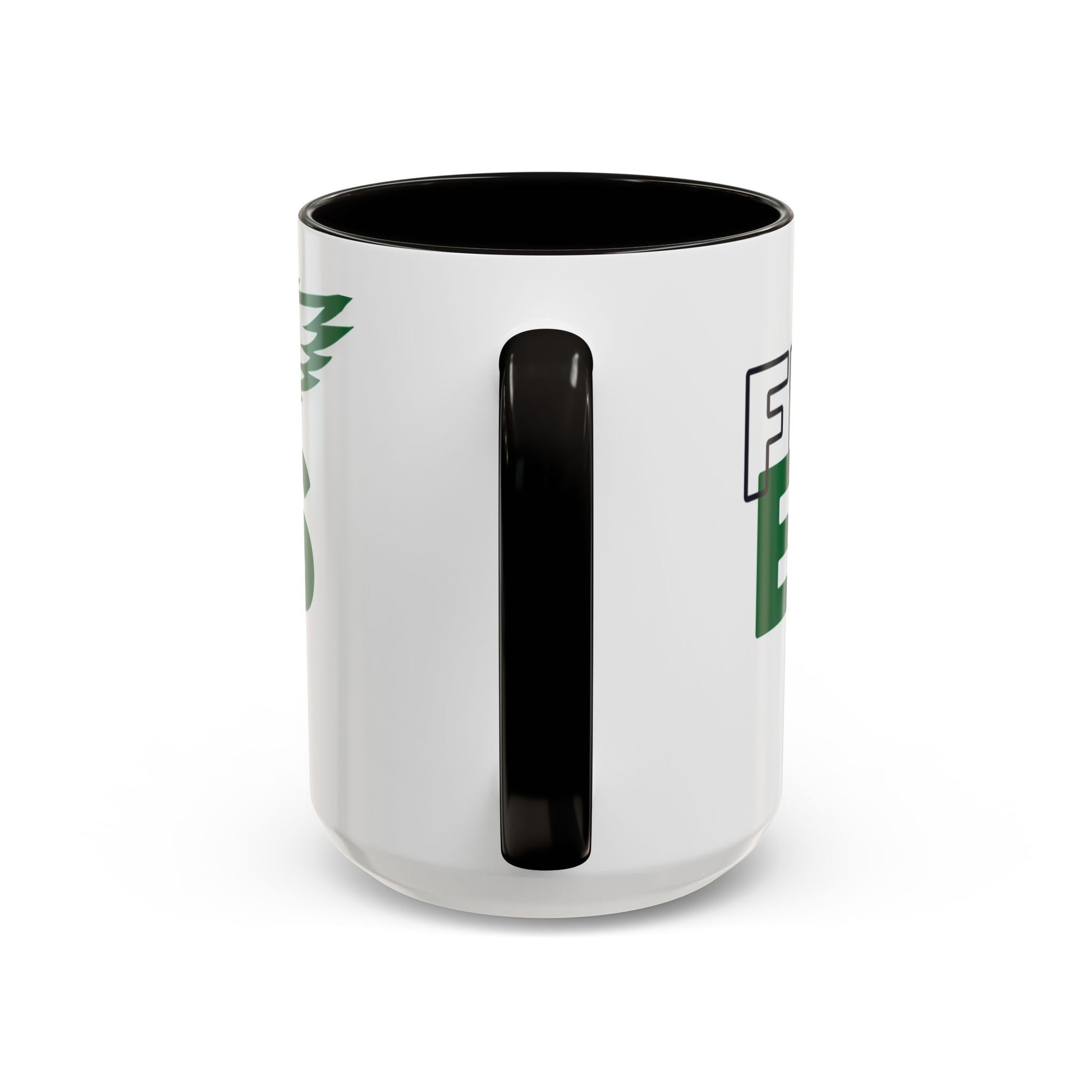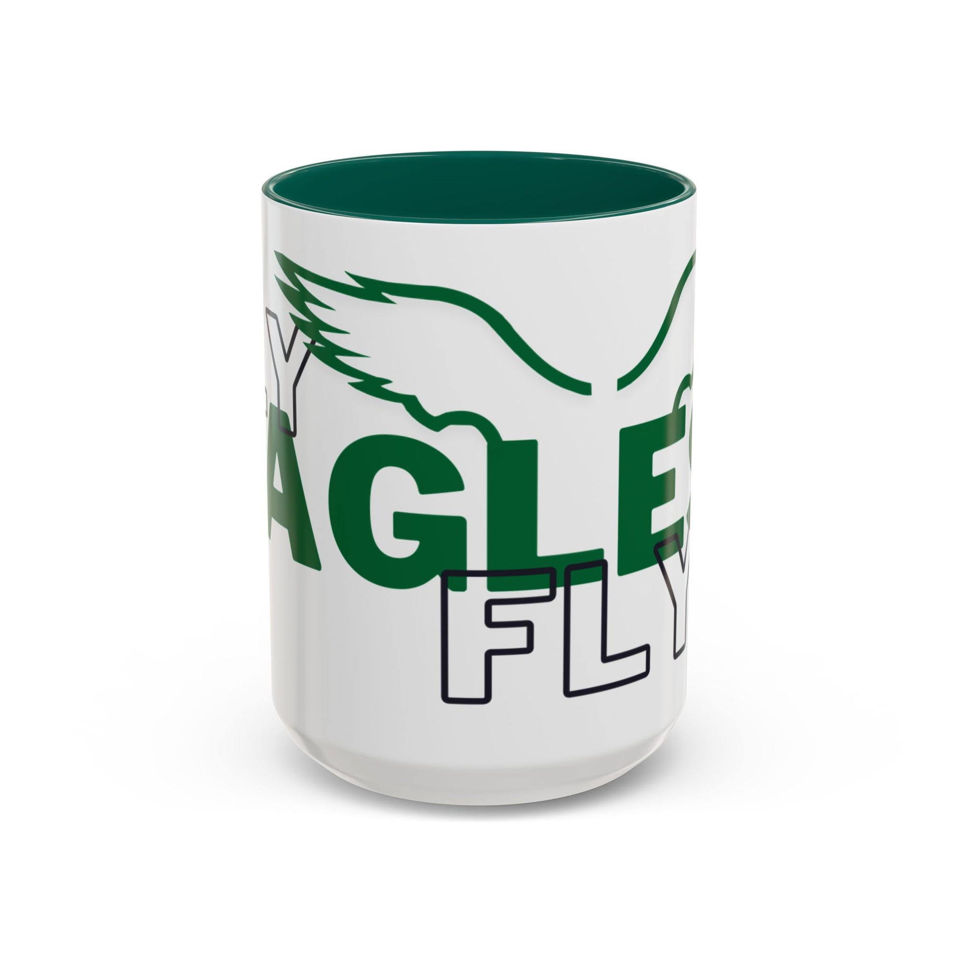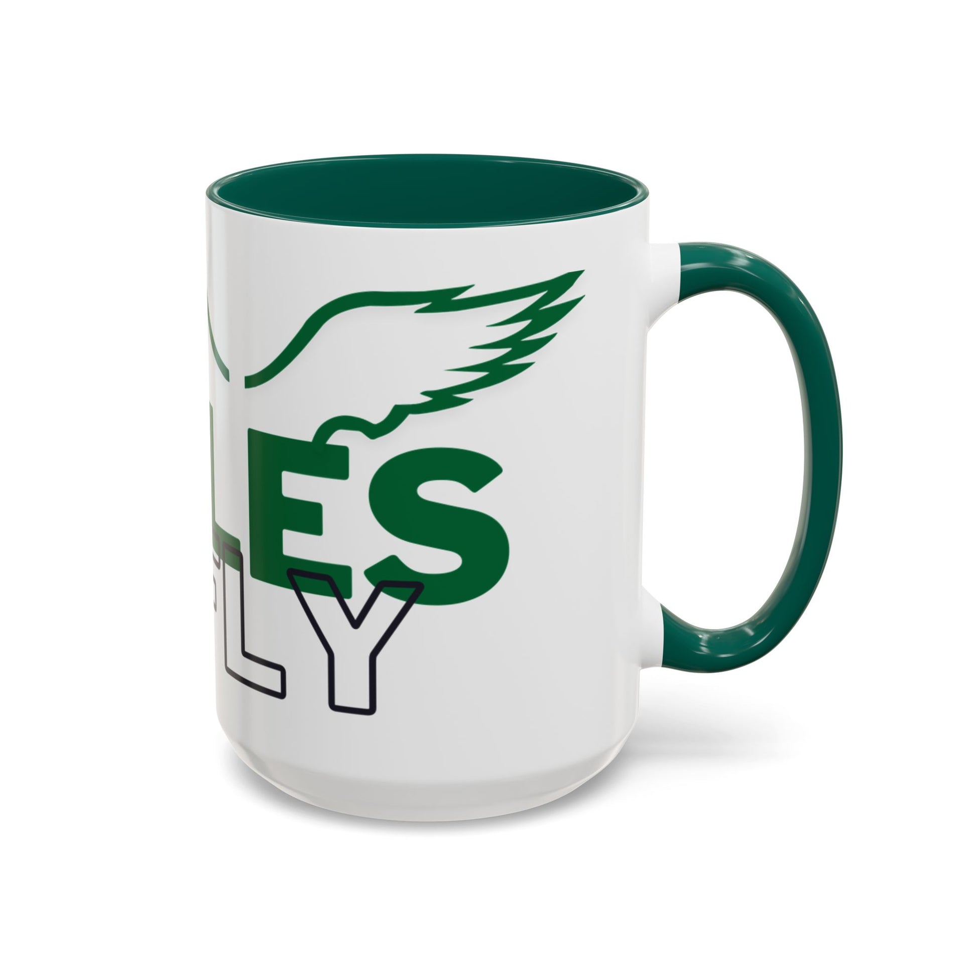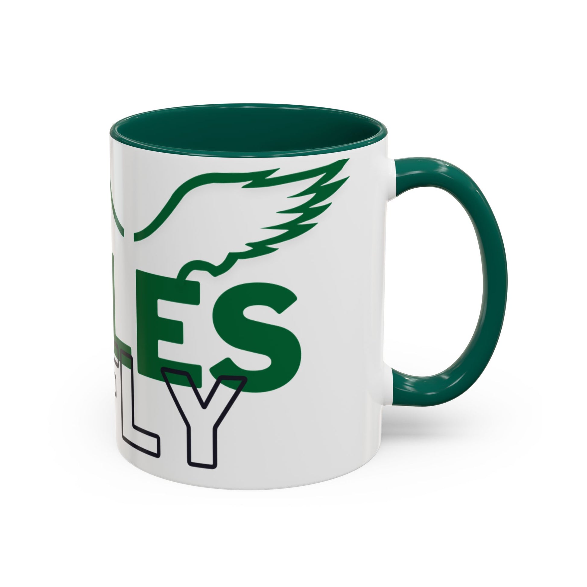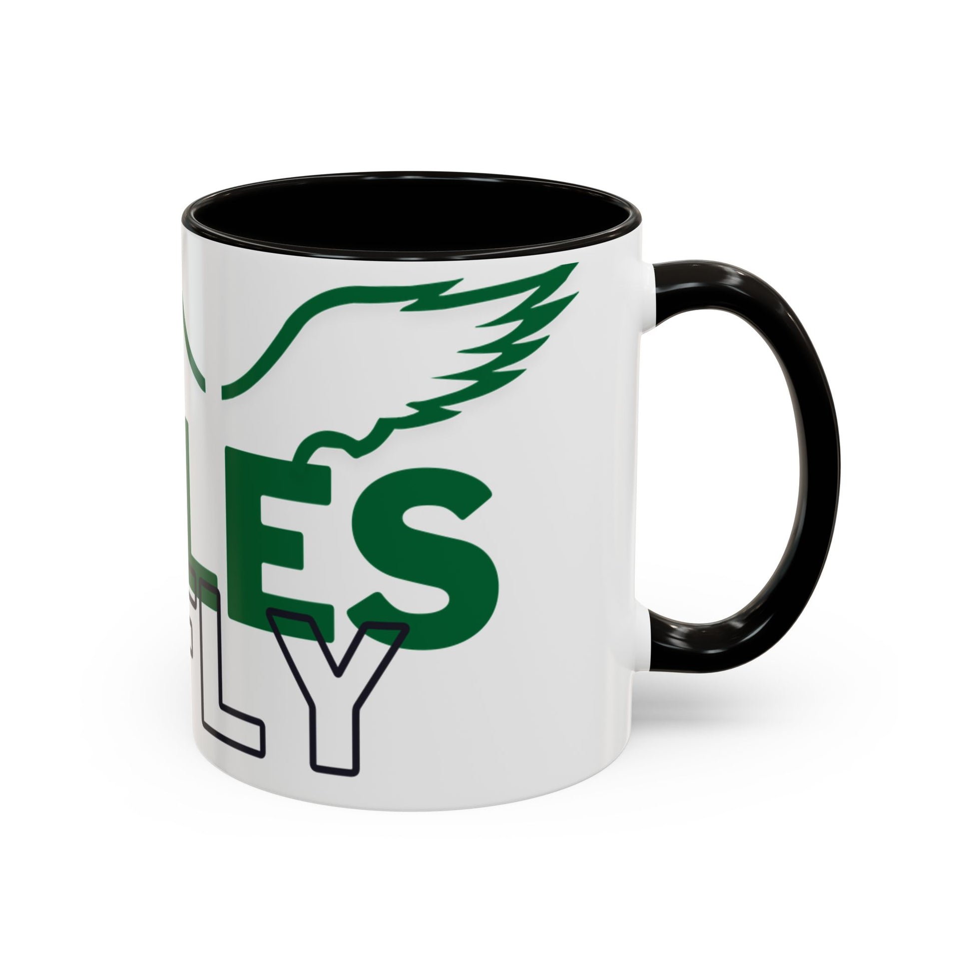 Bright, glossy ceramic mug that brings team spirit to every sip. The bold green lettering and winged eagle silhouette pop against a clean white background, while a contrasting black interior and handle add a sharp, modern finish. Lightweight enough for daily use, the comfortable C-shaped grip fits naturally in the hand during early-morning coffee runs, late-night study sessions, or sideline cheering. Durable ORCA coating keeps colors vivid through frequent dishwasher cycles and microwave reheats, so the design stays lively wash after wash. Offered in two volumes to suit big brews or modest cups, this mug lets fans show allegiance in style.
