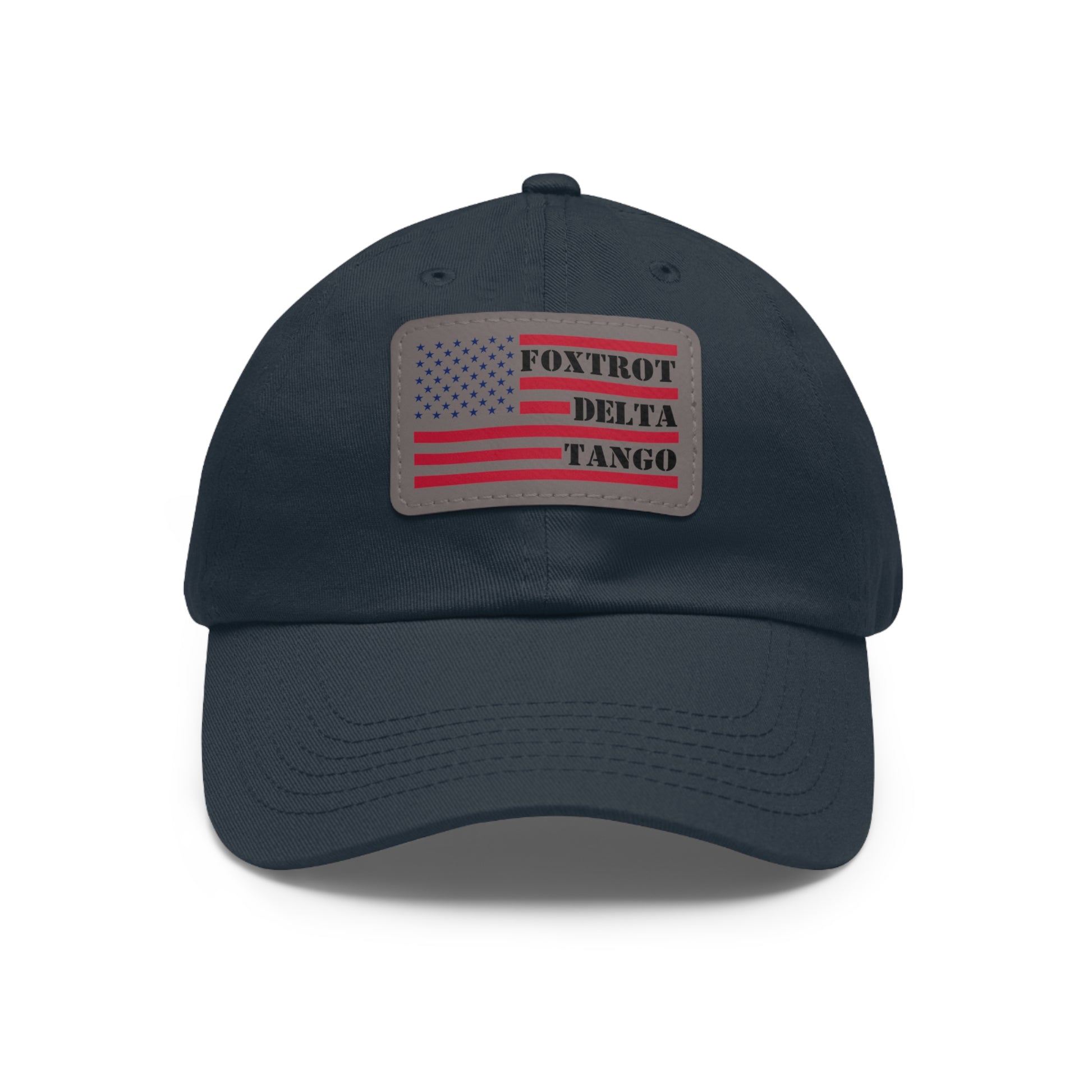 FOXTROT DELTA TANGO Anti-Trump Statement Dad Hat with Faux Leather Patch, perfect for those looking to make a political statement in a subversive and patriotic way. Ideal for individuals interested in political activism and protest. Relevant for Fourth of July, political events, rallies, and protests.