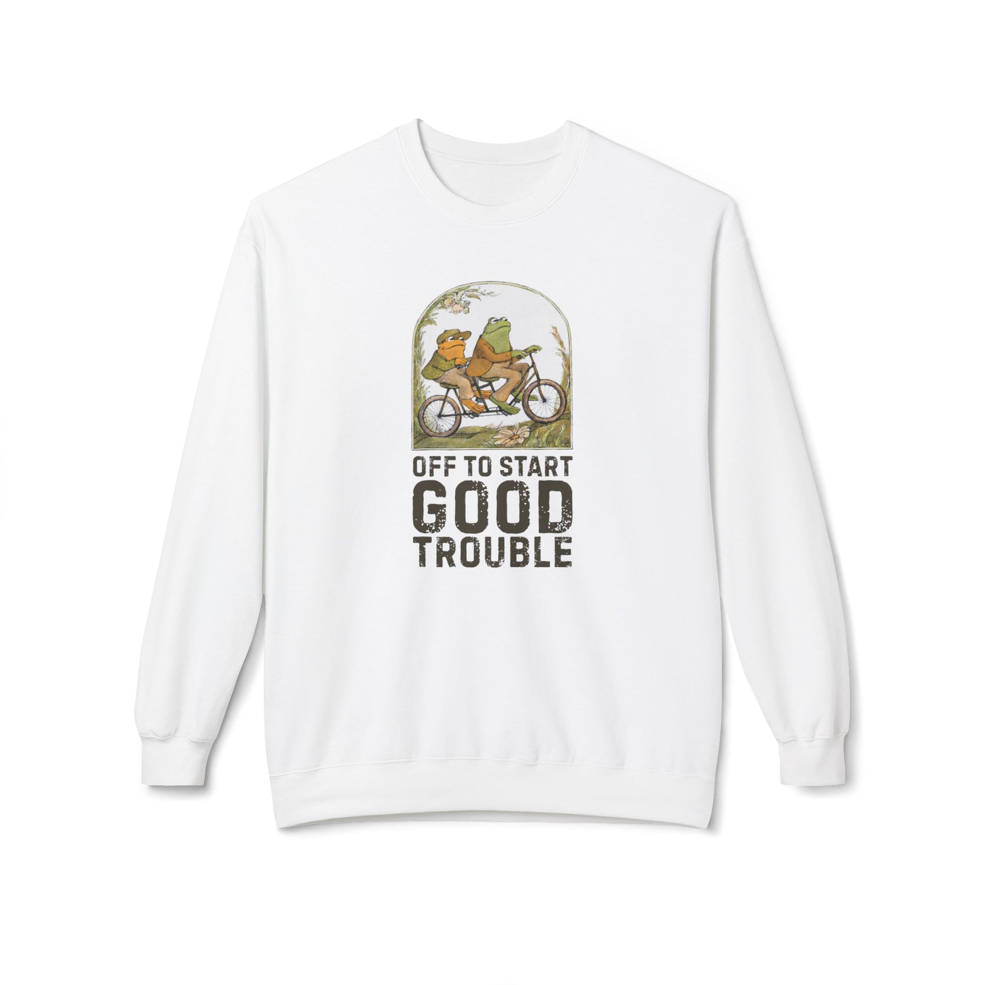 This sweatshirt features a design of frogs on bikes with the message 'Good Trouble', perfect for those passionate about political activism and protests. It exudes a rebellious and defiant vibe, making it a conversation starter and a statement piece. Ideal for individuals who support anti-Trump, anti-ICE movements and embody the spirit of resistance. Great for wearing to protests, rallies, or casual outings.