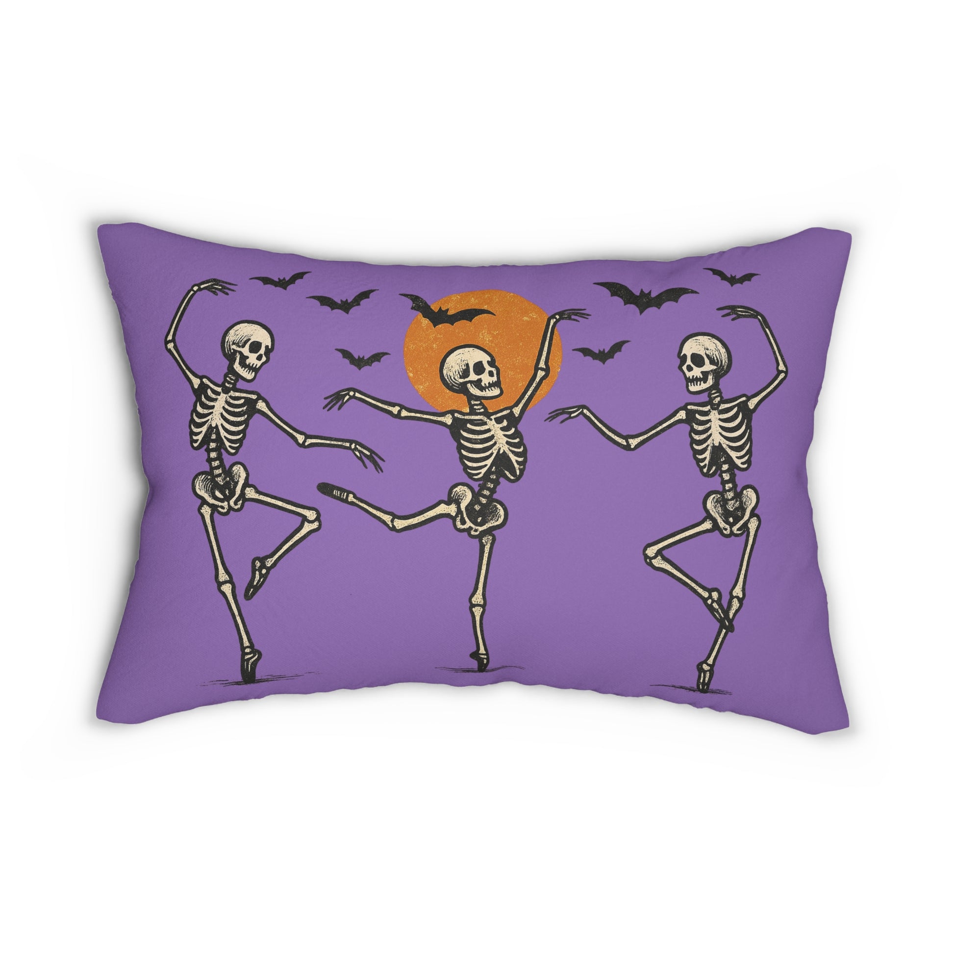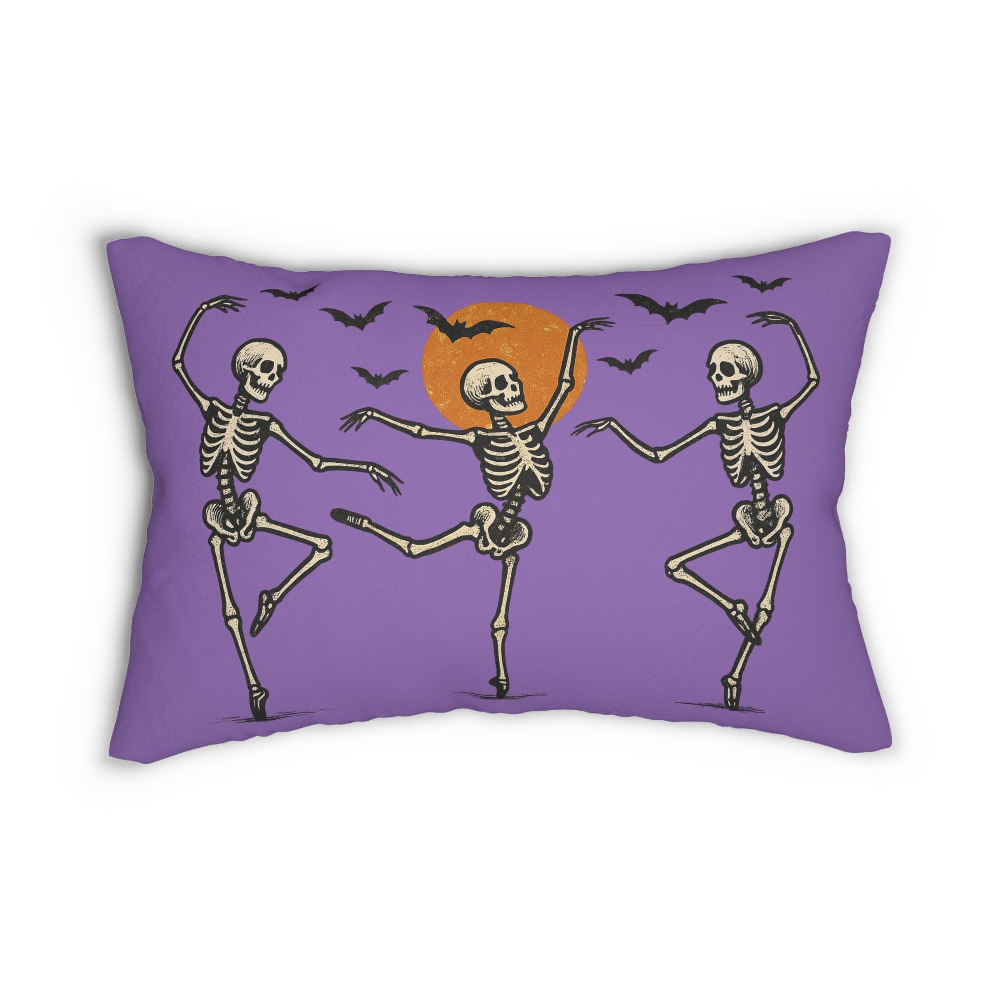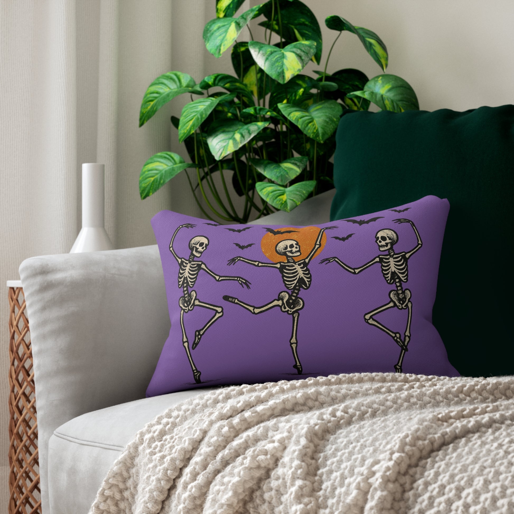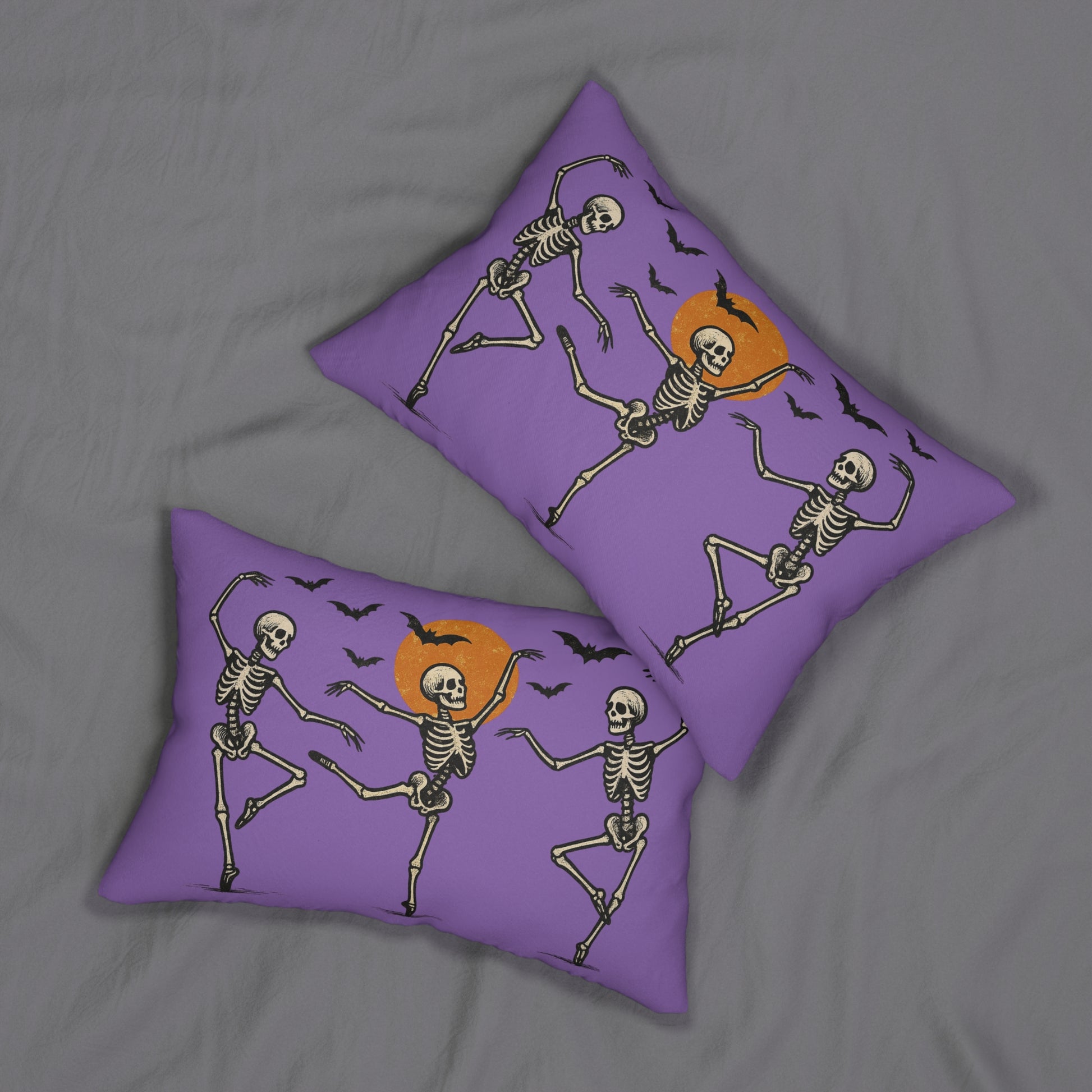 Add a touch of whimsical charm to your space with this vibrant lumbar pillow. Featuring lively dancing skeletons against a festive purple backdrop, it brings a playful vibe that perfectly complements Halloween and autumn decor. The double-sided print means the fun can be seen from any angle, making it a delightful addition to your living room, bedroom, or even a cozy reading nook. Ideal for those who love unique decorations or are looking to celebrate the spooky season in style, this pillow is more than just a decorative item; it’s a conversation starter! It’s perfect for Halloween parties, seasonal gatherings, or simply to bring some joy into your everyday life. Embrace the fun and festive atmosphere with this eye-catching piece that adds personality to any room.