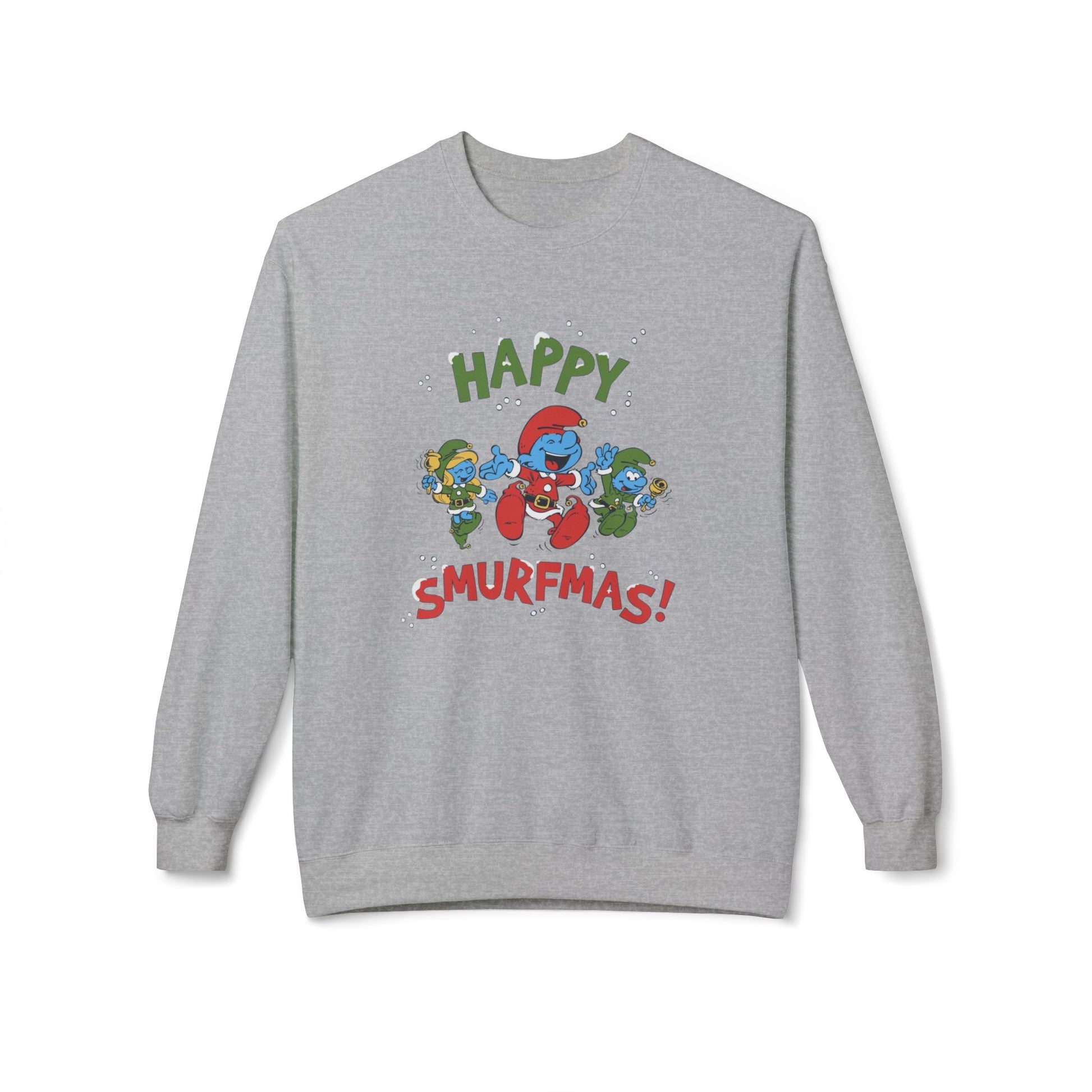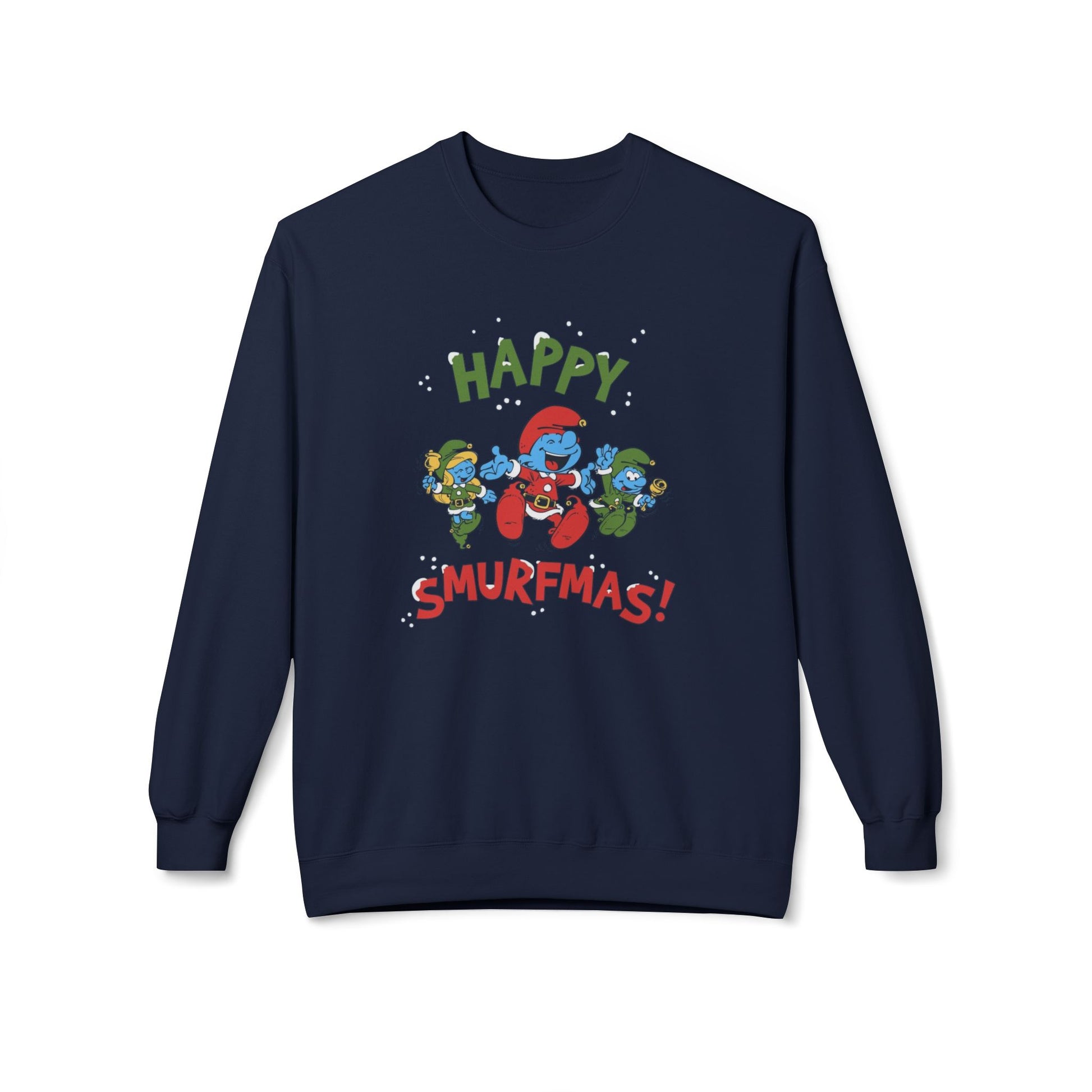 Slide into a cozy, nostalgic moment with this midweight crewneck that brings playful holiday cheer to cool evenings. The scene on the front evokes family chaos and laughter: bright blue characters in Santa hats, candy canes, and confetti, all shouting “Happy Smurfmas!” The relaxed dropped shoulders and classic fit let you move easily—reach for hot cocoa, hang twinkle lights, or join a rowdy carol sing-along. The fabric’s substantial weight keeps warmth without the bulk, while soft ring-spun cotton feels gentle against skin. Wear it while wrapping gifts, driving to a neighborhood light stroll, or lounging by the tree; it reads like an inside joke shared between friends and family who love cozy, whimsical holiday vibes.