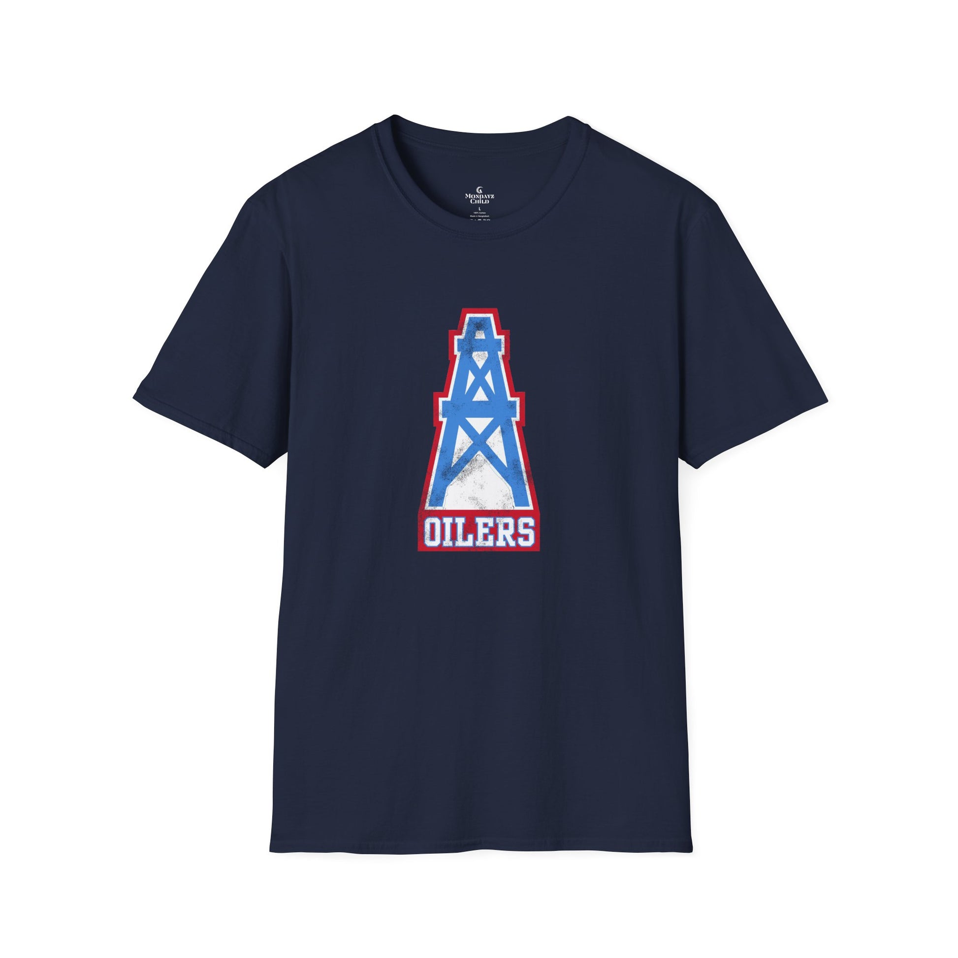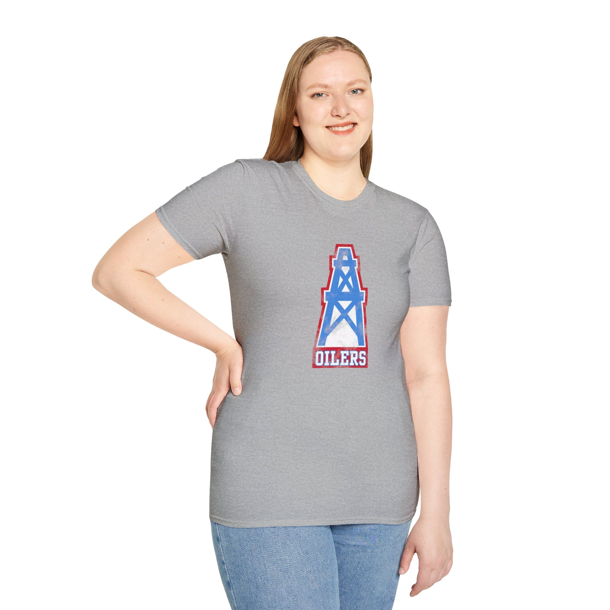 Vintage Style Houston Oilers Unisex T-shirt - distressed Oil Derrick design - available in sizes up to 5X. Perfect for fans of the Houston Oilers or anyone looking for a retro sports vibe. Ideal for casual wear or to show team spirit during football season.