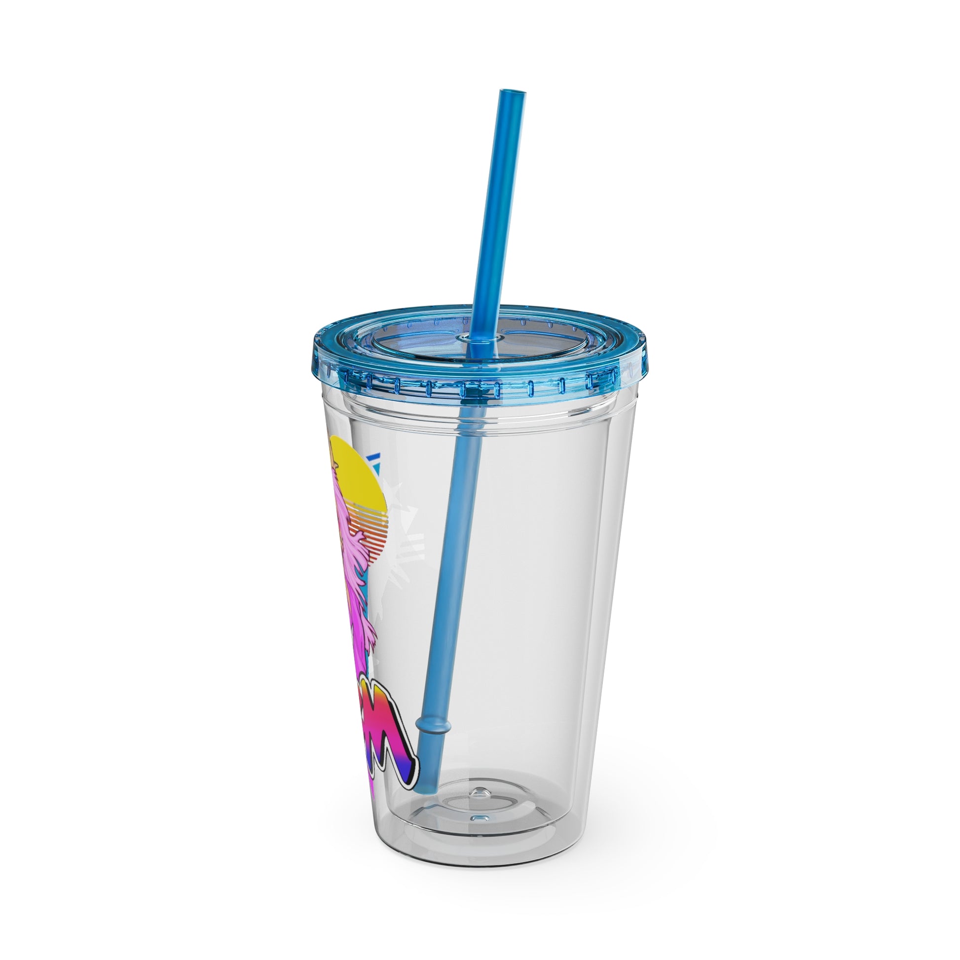 A Truly Outrageous 16oz Acrylic Tumbler with Colored Lid and Straw featuring the iconic Jem and the Holograms from the 1980s. This vibrant tumbler is perfect for fans of retro classic cartoons, adding a pop of color to your daily routine. Ideal for those looking for a fun and nostalgic touch to their beverages, whether hot or cold.