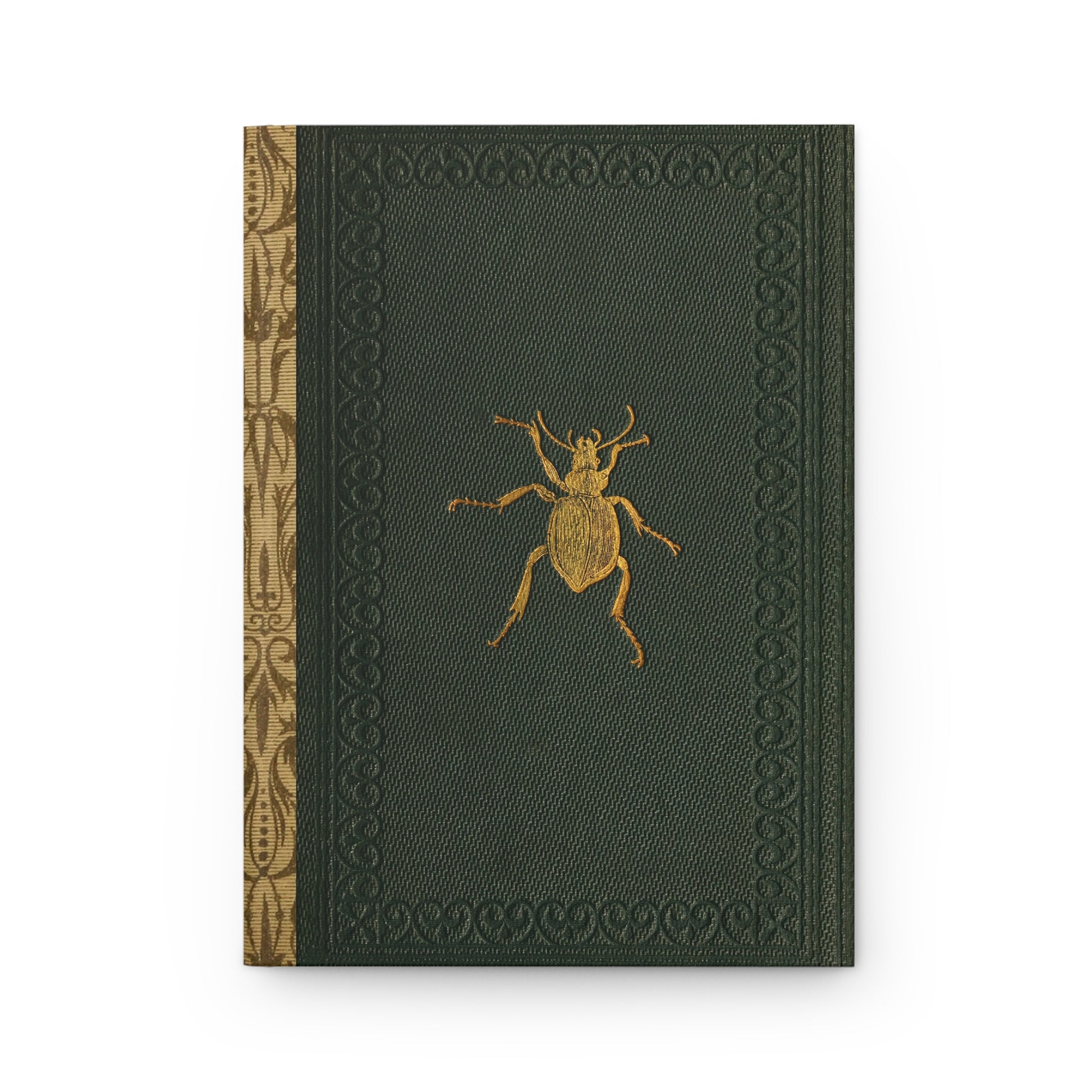 Make your everyday journaling and note-taking more personal, private, and stylish with this matte hardcover journal. Available in 5.75"x8", with 150 lined pages, this sturdy lined hardcover journal with a copy of a antique book featuring a gold beetle, with green and gold accents, makes a great gift or composition notebook.