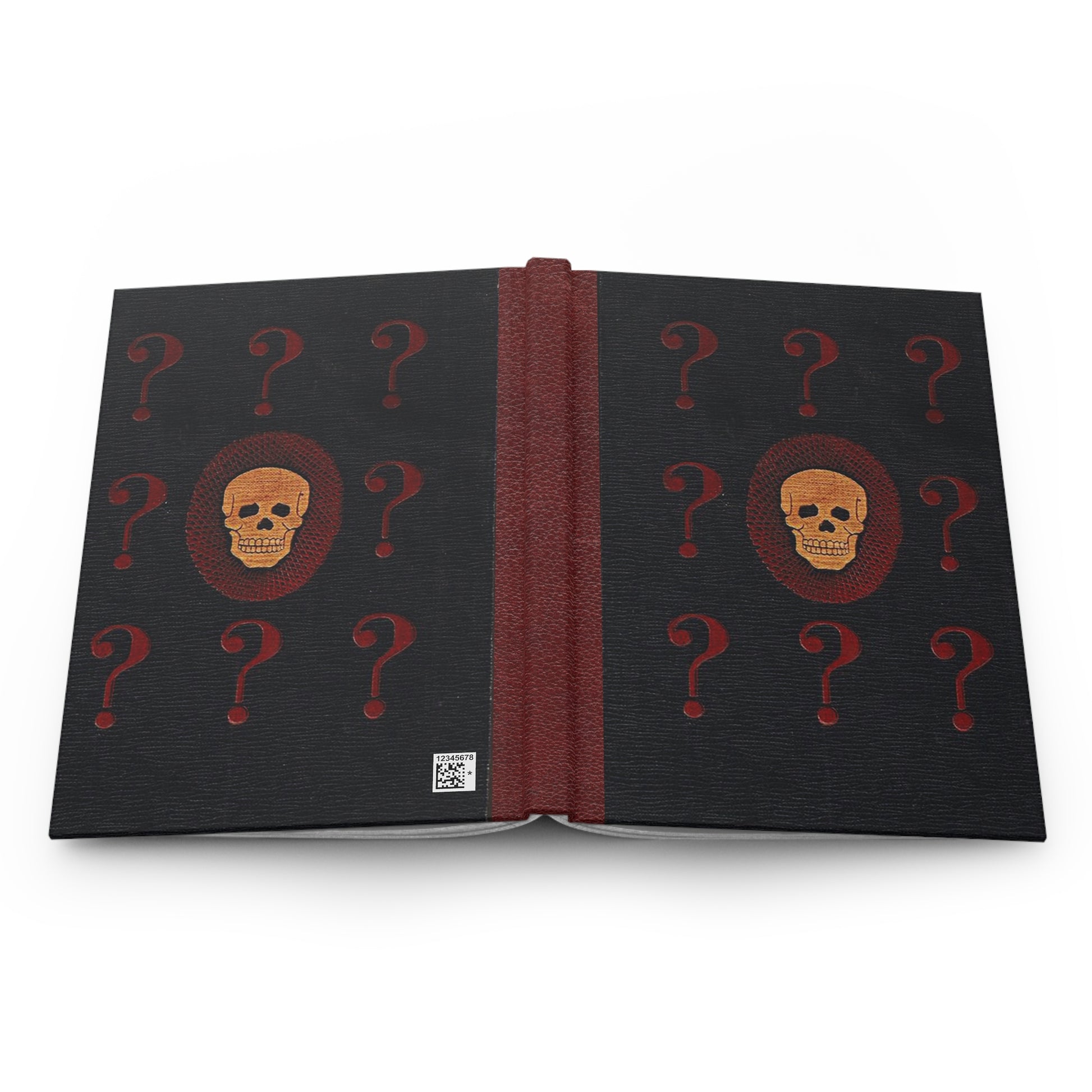 Make your creative writing, everyday journaling and note-taking more personal, private, and ever so moodily stylish with this matte hardcover journal. Available in 5.75"x8", with 150 lined pages, this sturdy lined hardcover journal with a red and black antique-look cover and back features a red binding, white skull, and red question marks. Makes a great Halloween gift or spells notebook.