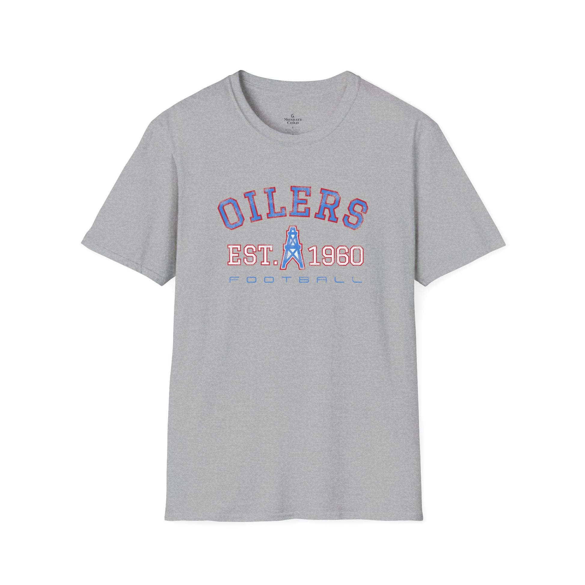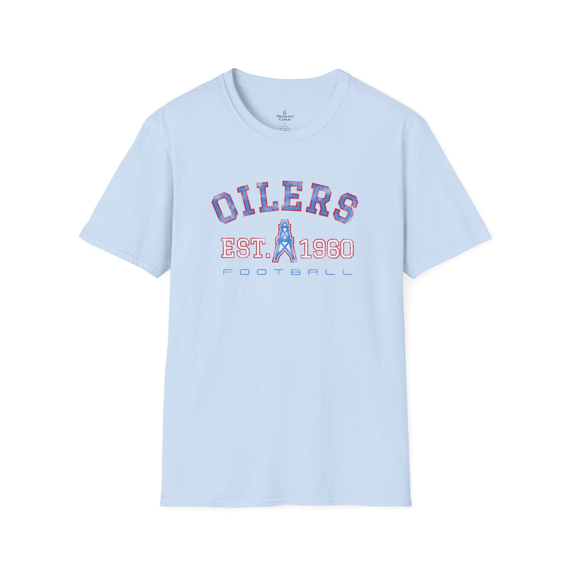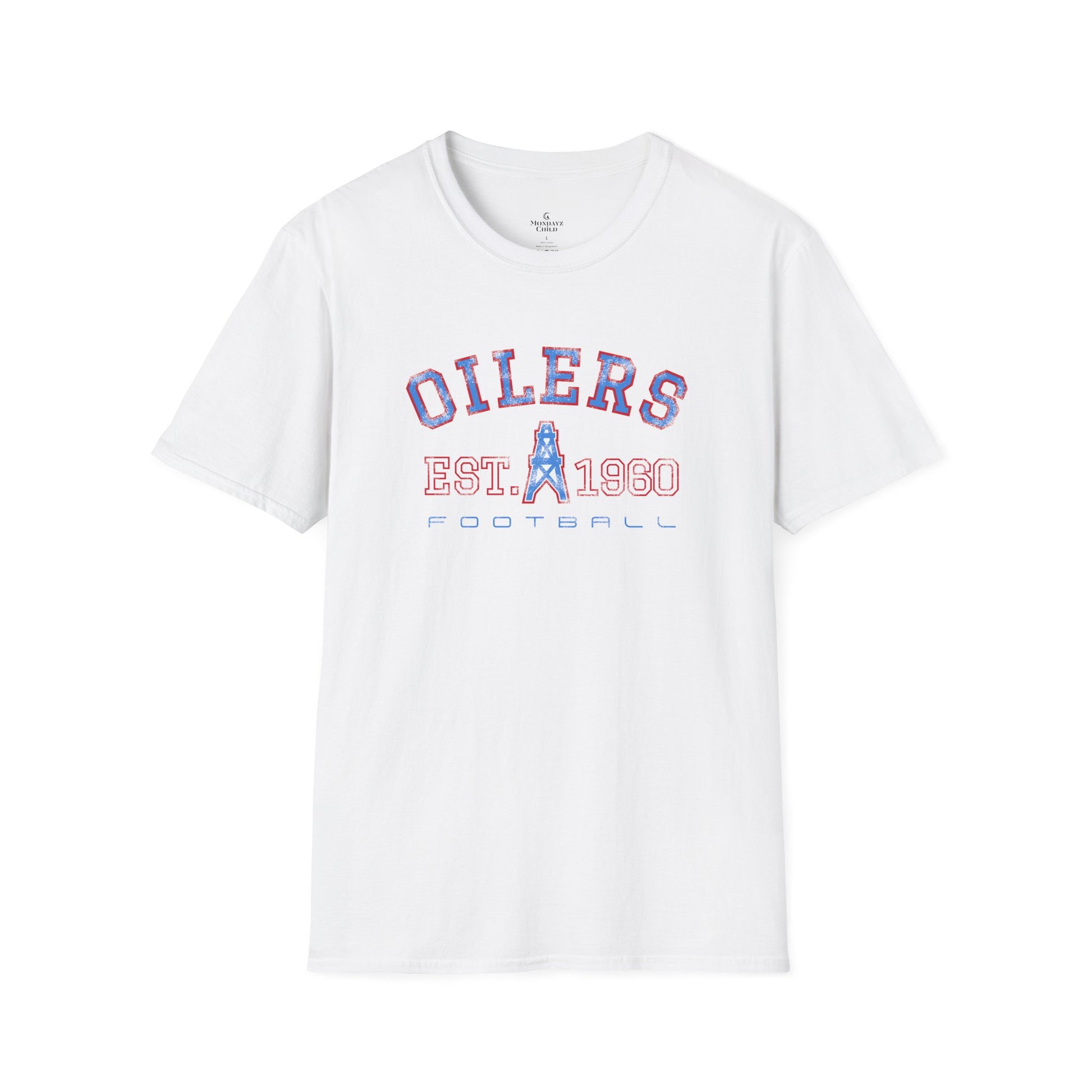 Vintage Style Houston Oilers Unisex T-shirt - "Oilers Football, Est. 1960" - available in sizes up to 5X. Perfect for fans of the Houston Oilers or anyone looking for a retro sports vibe. Ideal for casual wear or to show team spirit during football season.