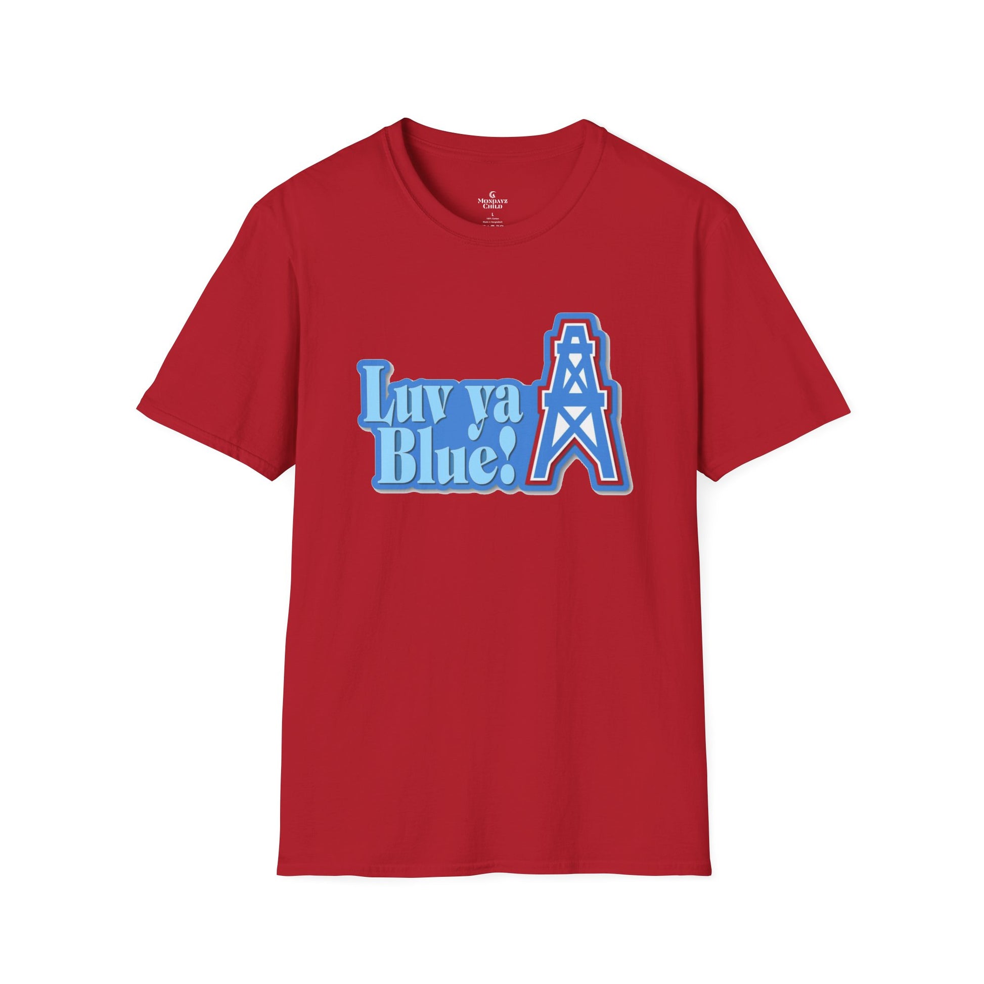 Vintage Style Houston Oilers Unisex T-shirt - 'Luv Ya Blue' - in sizes up to 5X. Perfect for fans of the Houston Oilers or anyone looking for a retro sports vibe. Ideal for casual wear or to show team spirit during football season.
