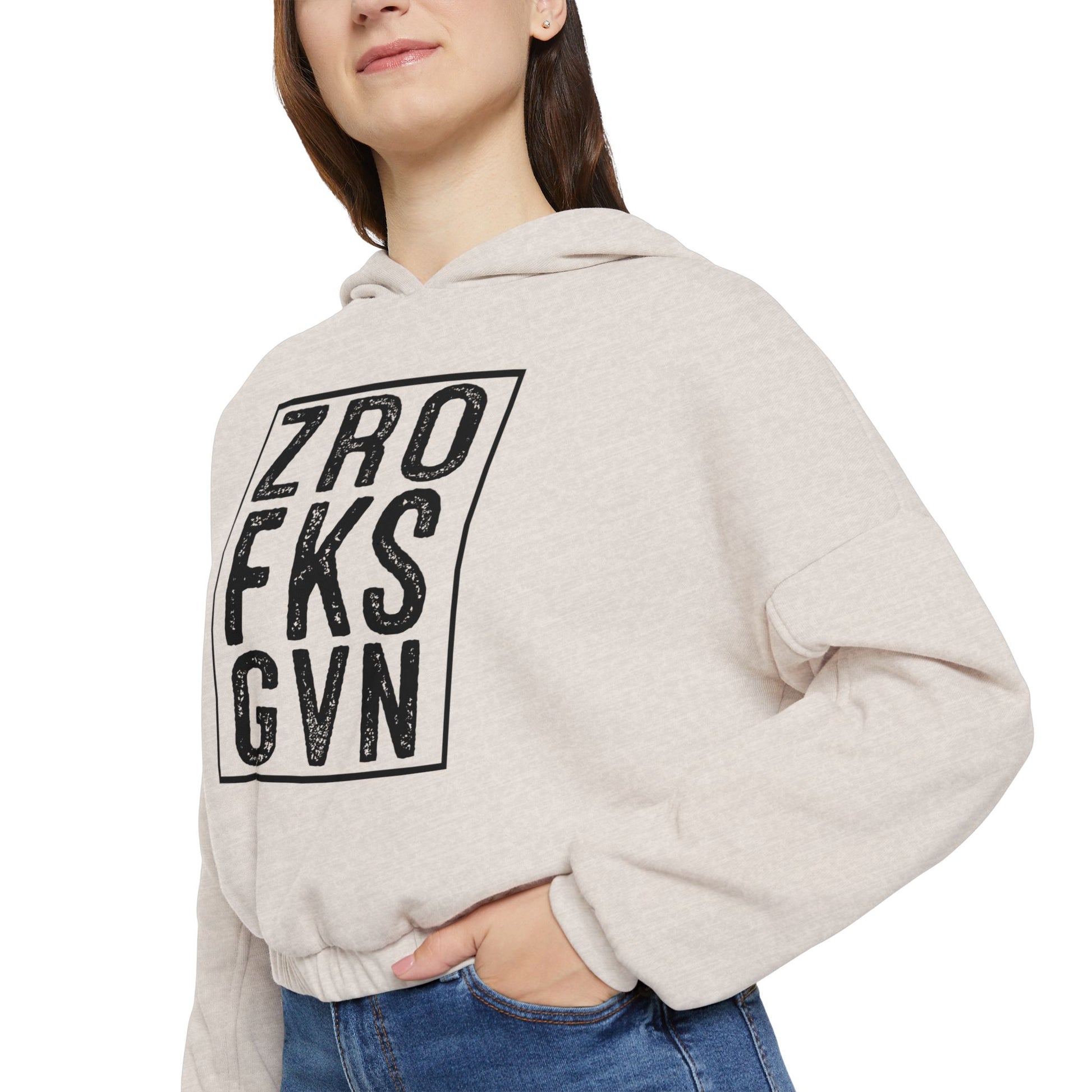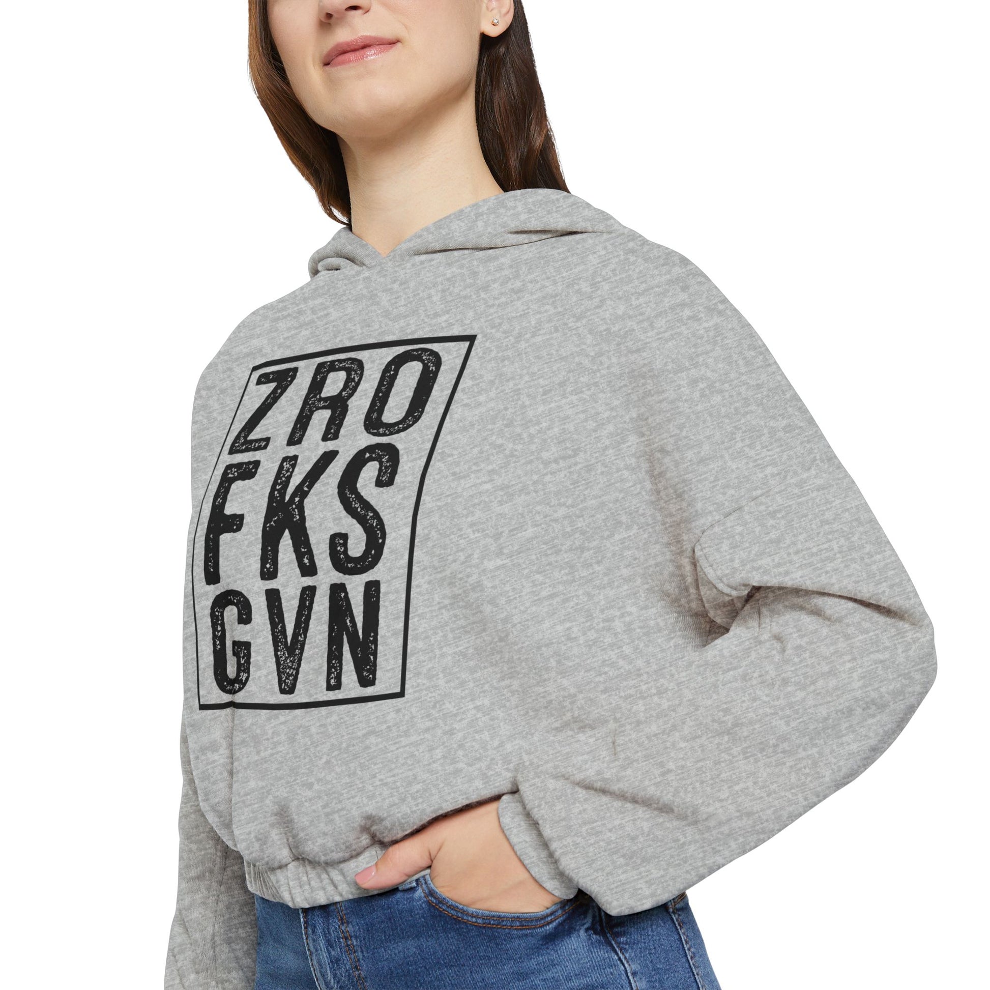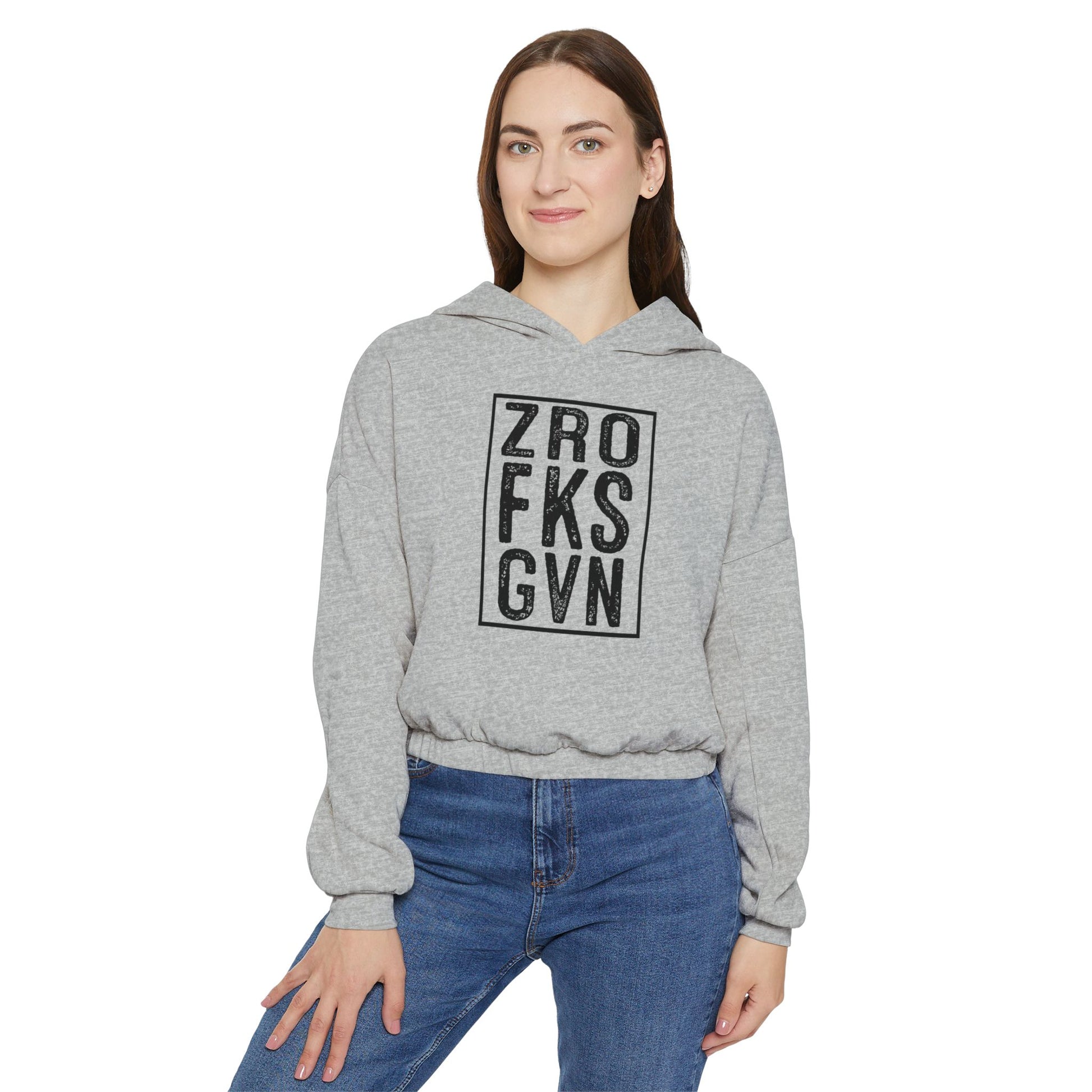 Sassy, funny, sarcastic women’s cinched-bottom cropped hoodie perfect for bold and confident individuals. The 'ZRO FKS GVN' design adds attitude and style to your wardrobe, giving off a rebellious and carefree vibe. A versatile piece that can be worn casually or as a statement piece, ideal for lounging at home or hanging out with friends. Relevant for those who appreciate humor and want to express their bold personality. Suitable for casual outings, social gatherings, or as a fun gift for birthdays or holidays like International Women's Day.