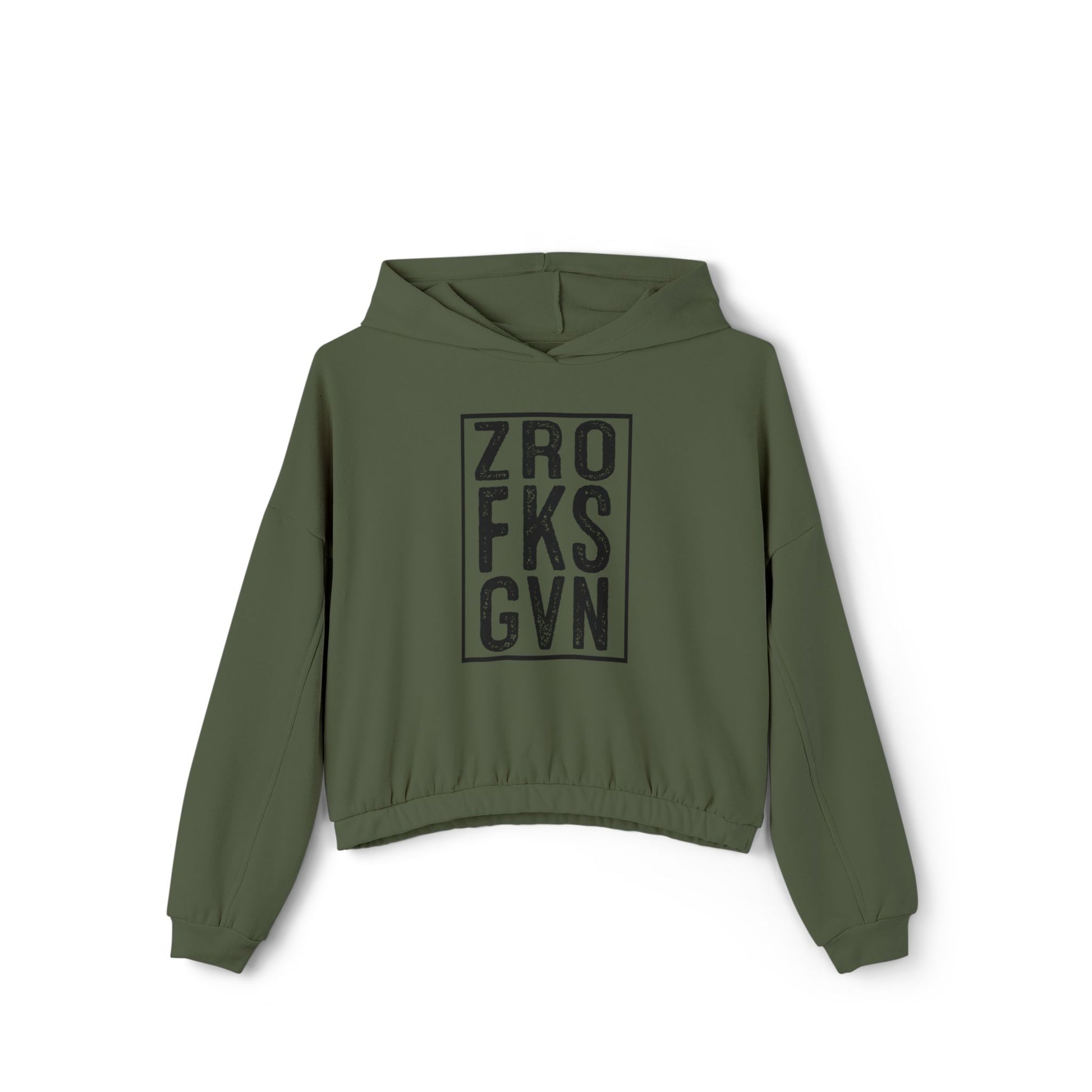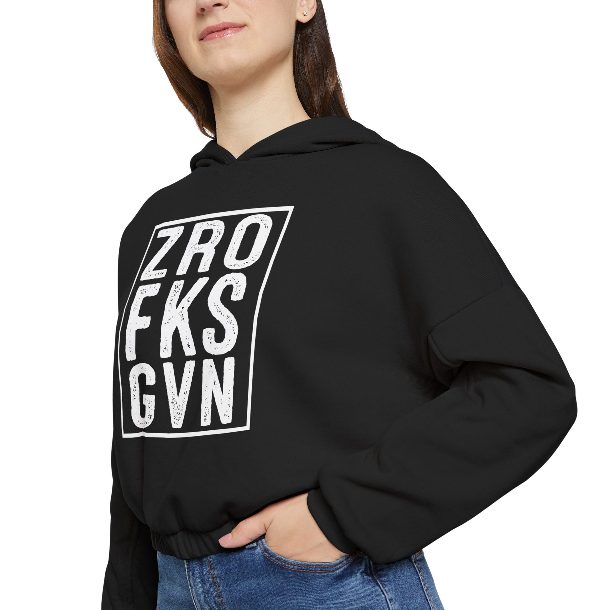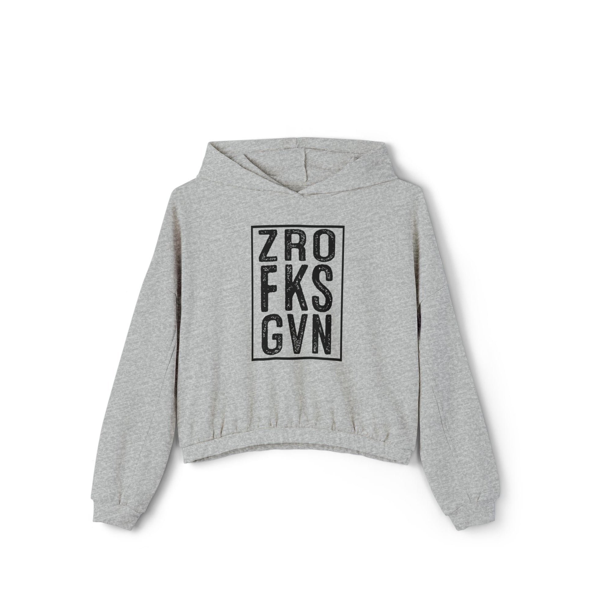 Sassy, funny, sarcastic women’s cinched-bottom cropped hoodie perfect for bold and confident individuals. The 'ZRO FKS GVN' design adds attitude and style to your wardrobe, giving off a rebellious and carefree vibe. A versatile piece that can be worn casually or as a statement piece, ideal for lounging at home or hanging out with friends. Relevant for those who appreciate humor and want to express their bold personality. Suitable for casual outings, social gatherings, or as a fun gift for birthdays or holidays like International Women's Day.